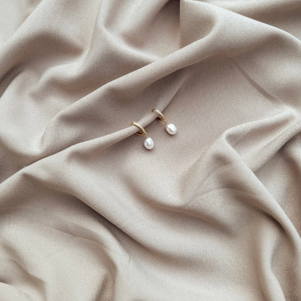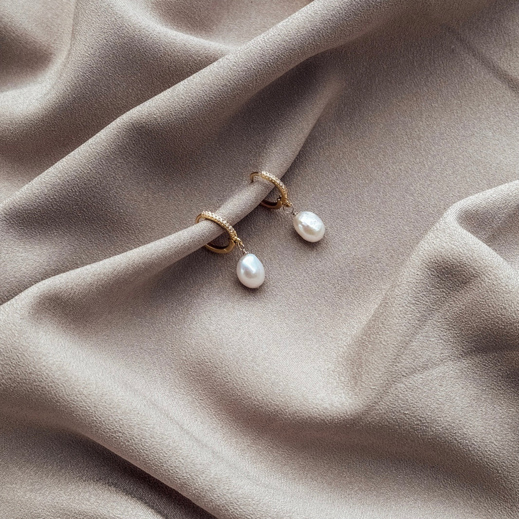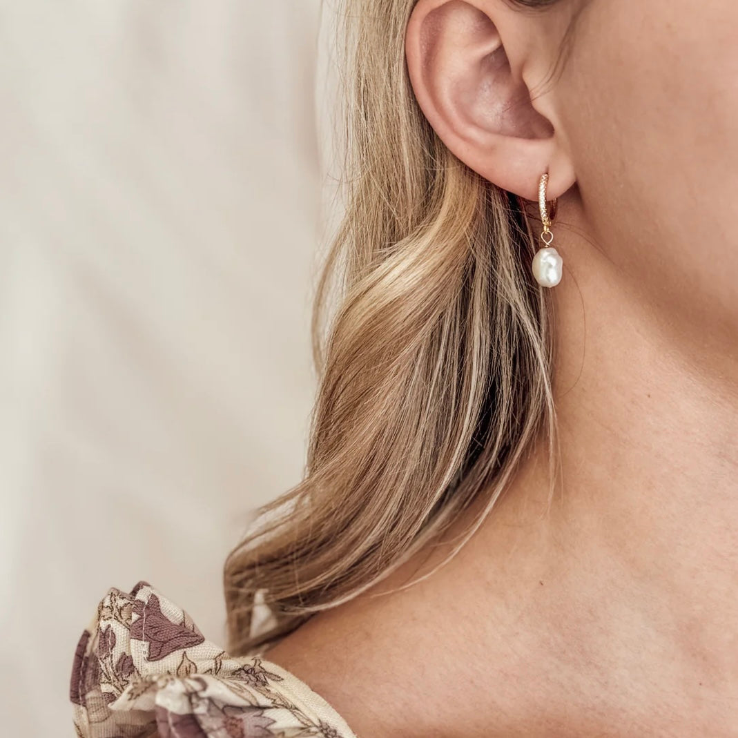 - Introducing the 18K Gold-Filled Micropave CZ Huggie Hoop, beautifully accented with a delicate freshwater pearl charm.